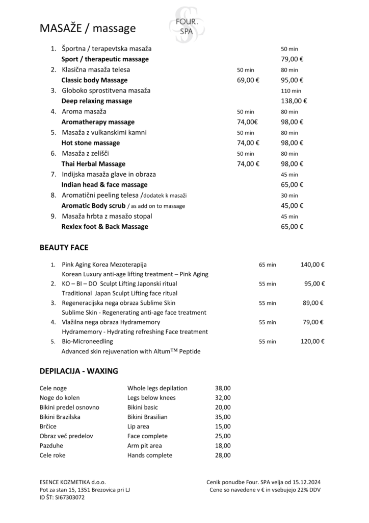 Storitve je možno brezplačno odpovedati do 24 ur pred rezerviranim terminom, za odpoved do 4 ure prej se zaračuna 50 %. Za kasnejšo odpoved ali nekoriščenje storitve brez odpovedi se zaračuna polna cena.